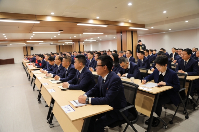 集團公司高層領(lǐng)導(dǎo)、中級管理人員、受表彰獎勵的優(yōu)秀單位和個人、總部全體及2023年度新員工,共計300余人參加了會議。副總經(jīng)理、總會計師嚴海軍主持會議。
